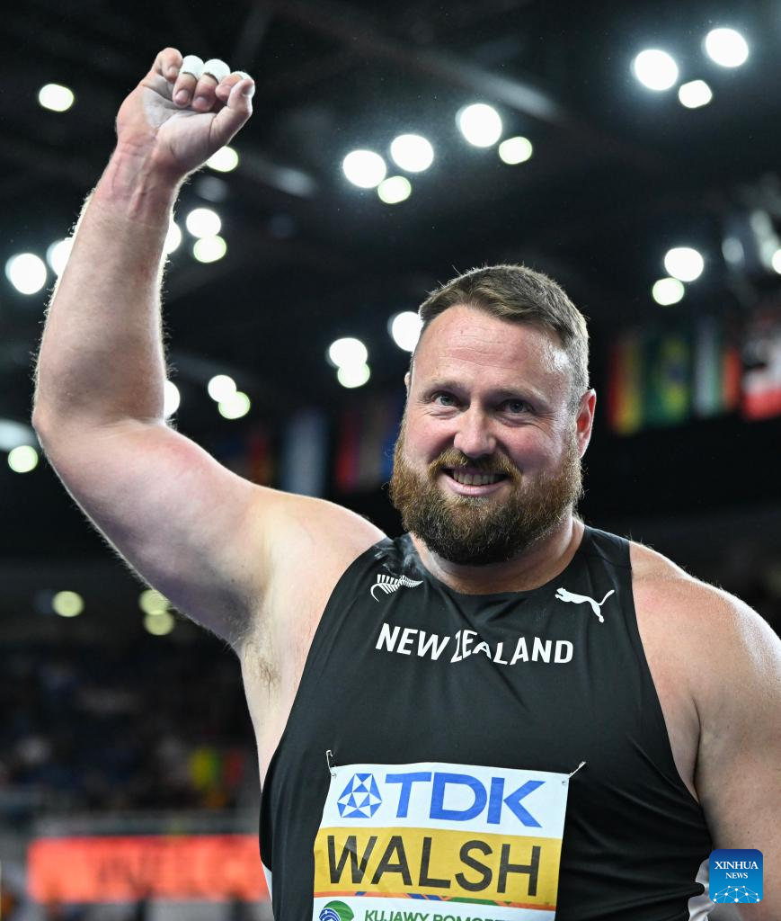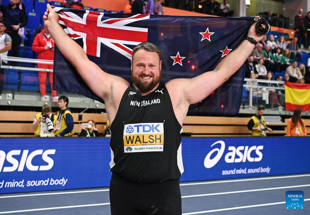 Tom Walsh of New Zealand celebrates during the men's shot put final at the 2026 World Athletics Indoor Championships in Torun, Poland, March 22, 2026. (Xinhua/Zhang Haofu)