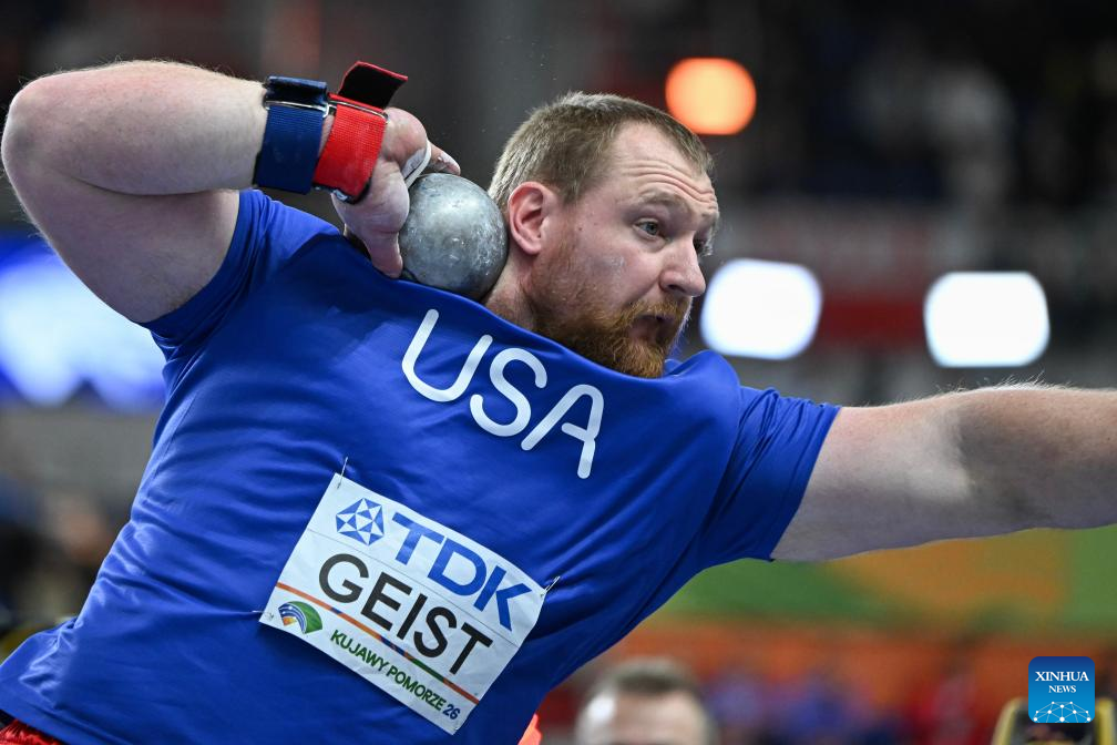 Jordan Geist of the United States competes during the men's shot put final at the 2026 World Athletics Indoor Championships in Torun, Poland, March 22, 2026. (Xinhua/Zhang Haofu)