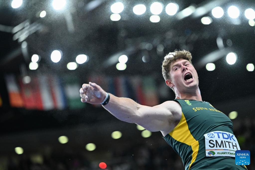 Aiden Smith of South Africa competes during the men's shot put final at the 2026 World Athletics Indoor Championships in Torun, Poland, March 22, 2026. (Xinhua/Zhang Haofu)
