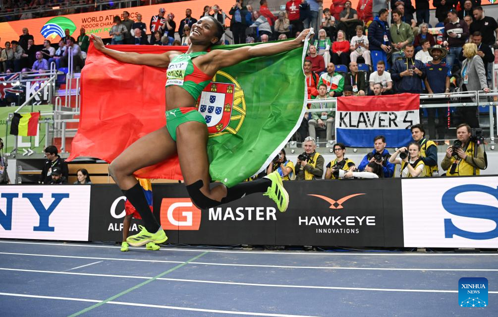 Agate De Sousa of Portugal celebrates after the women's long jump final at the 2026 World Athletics Indoor Championships in Torun, Poland, March 22, 2026. (Xinhua/Zhang Haofu)