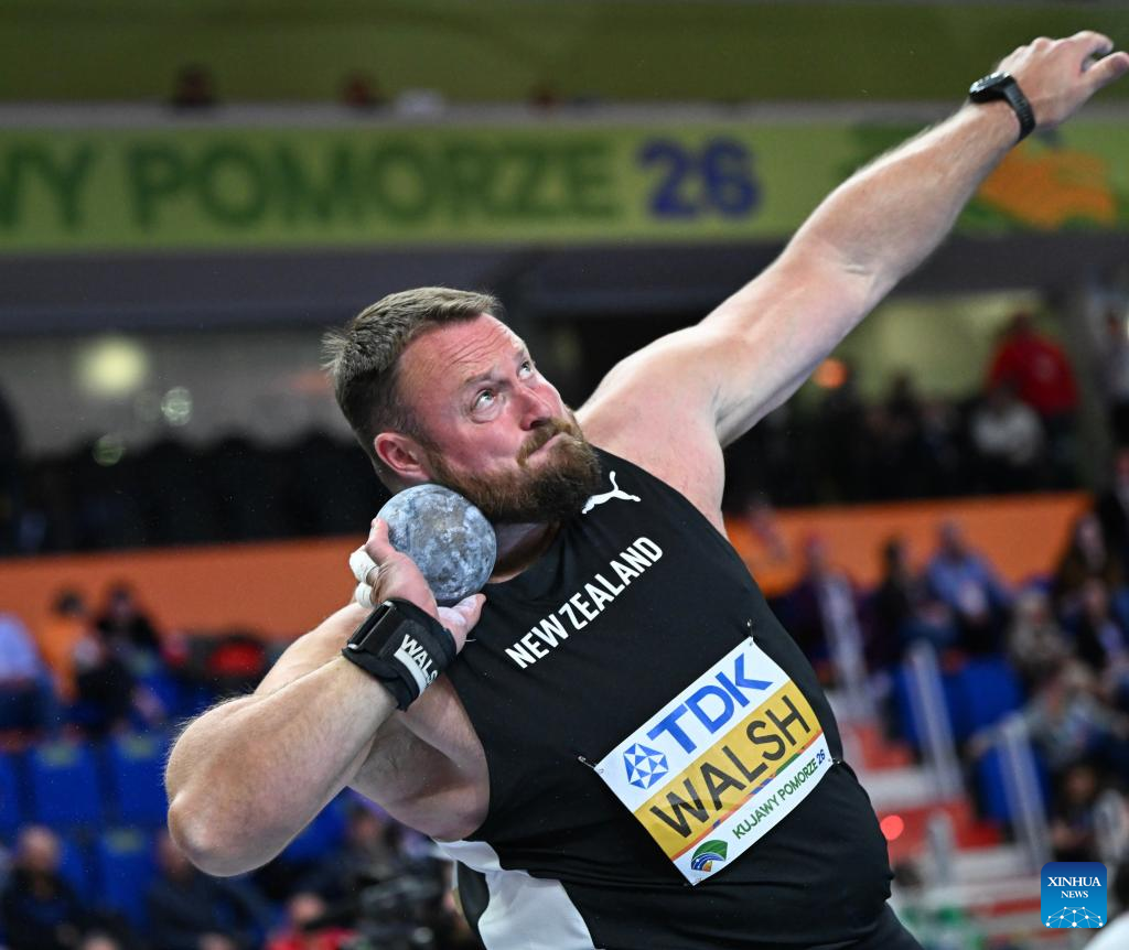 Tom Walsh of New Zealand competes during the men's shot put final at the 2026 World Athletics Indoor Championships in Torun, Poland, March 22, 2026. (Xinhua/Zhang Haofu)