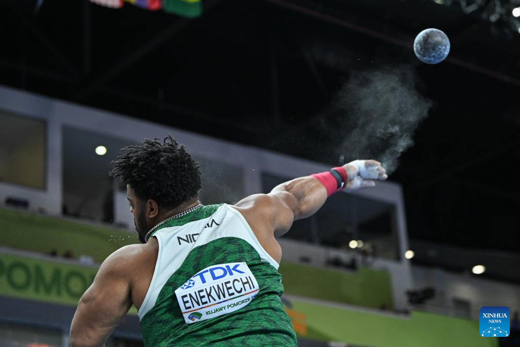 Chukwuebuka Enekwechi of Nigeria competes during the men's shot put final at the 2026 World Athletics Indoor Championships in Torun, Poland, March 22, 2026. (Xinhua/Zhang Haofu)