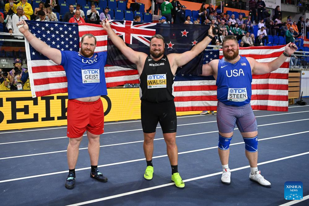 Gold medalist Tom Walsh (C) of New Zealand, silver medalist Jordan Geist (L) of the United States and bronze medalist Roger Steen of the United States celebrate after the men's shot put final at the 2026 World Athletics Indoor Championships in Torun, Poland, March 22, 2026. (Xinhua/Zhang Haofu)