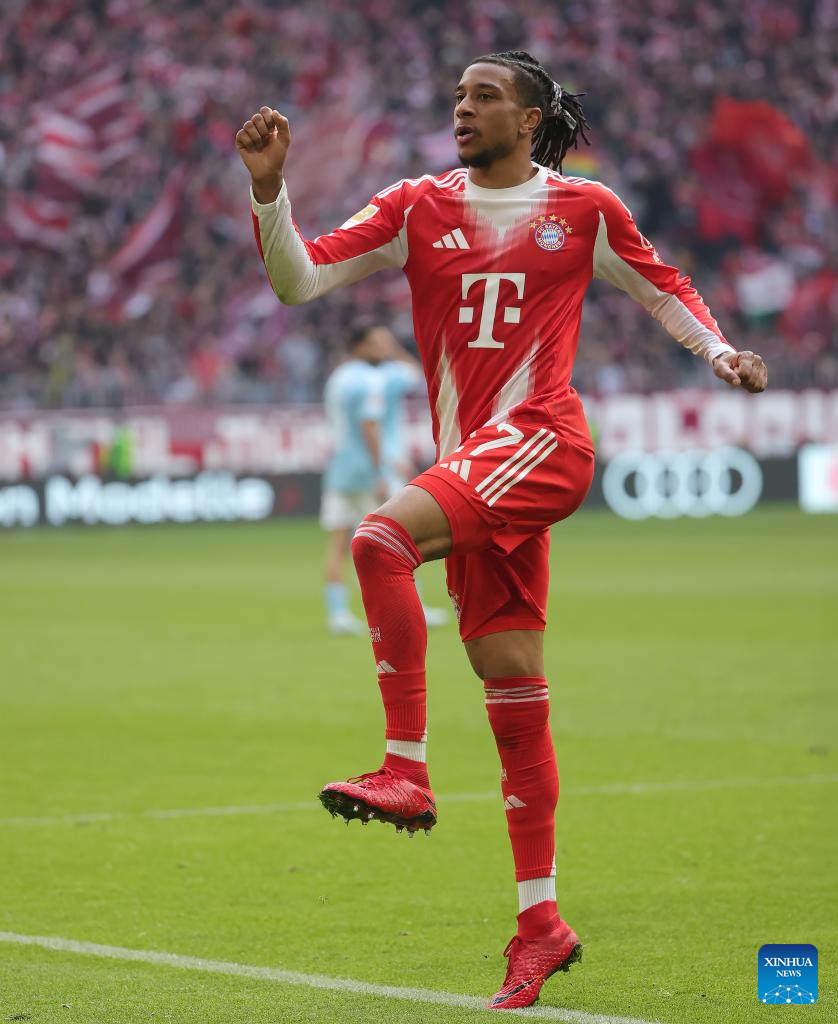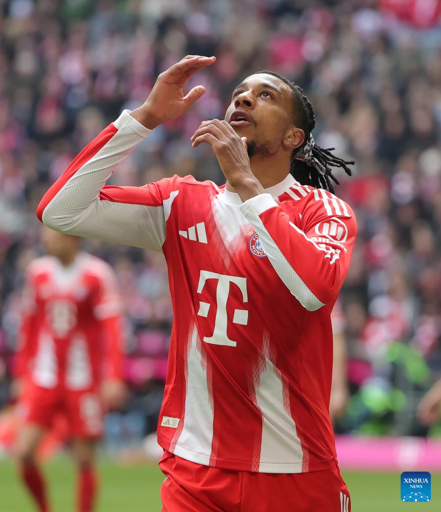 Serge Gnabry of FC Bayern Munich celebrates scoring during the German first division Bundesliga football match between FC Bayern Munich and 1. FC Union Berlin in Munich, Germany, March 21, 2026. (Photo by Philippe Ruiz/Xinhua)