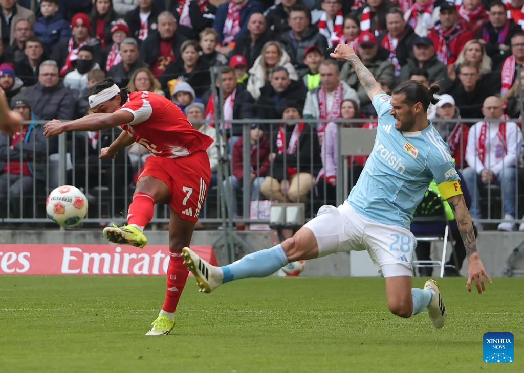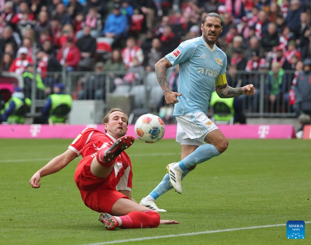 Harry Kane (L) of FC Bayern Munich competes during the German first division Bundesliga football match between FC Bayern Munich and 1. FC Union Berlin in Munich, Germany, March 21, 2026. (Photo by Philippe Ruiz/Xinhua)