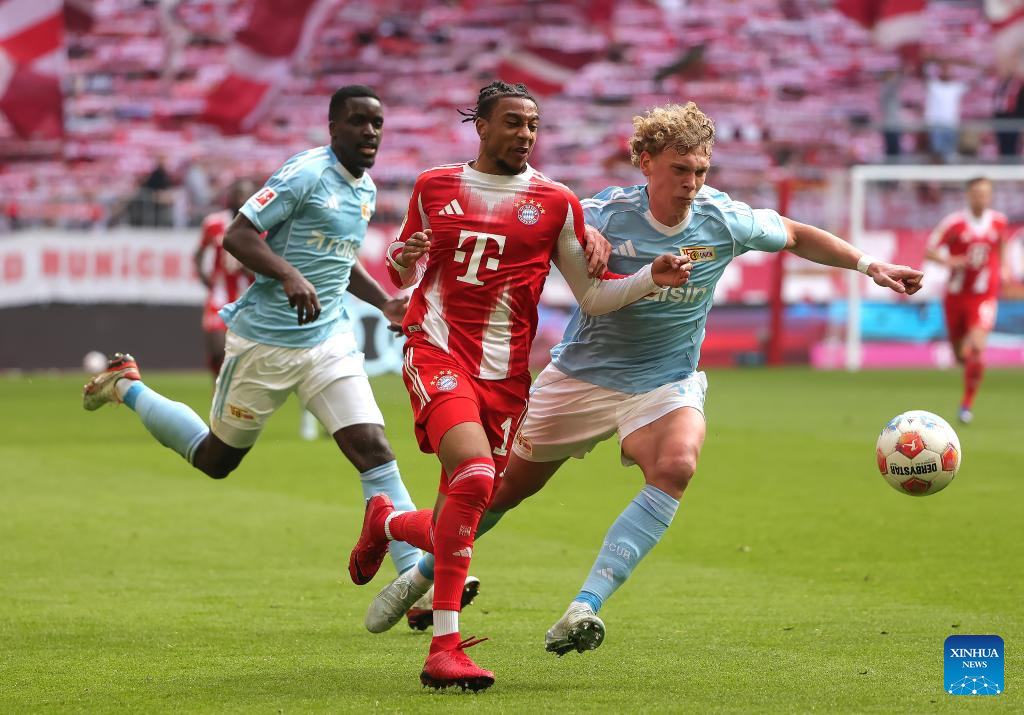 Michael Olise (C) of FC Bayern Munich breaks through during the German first division Bundesliga football match between FC Bayern Munich and 1. FC Union Berlin in Munich, Germany, March 21, 2026. (Photo by Philippe Ruiz/Xinhua)