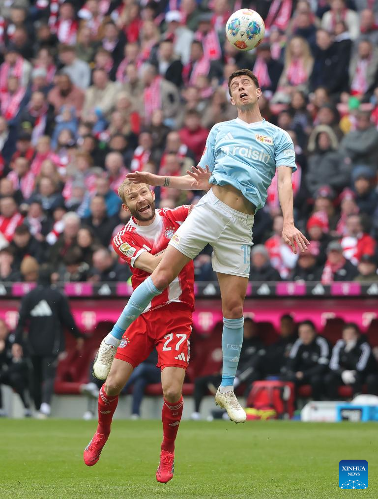 Konrad Laimer (L) of FC Bayern Munich vies with Janik Haberer of 1. FC Union Berlin during the German first division Bundesliga football match between FC Bayern Munich and 1. FC Union Berlin in Munich, Germany, March 21, 2026. (Photo by Philippe Ruiz/Xinhua)