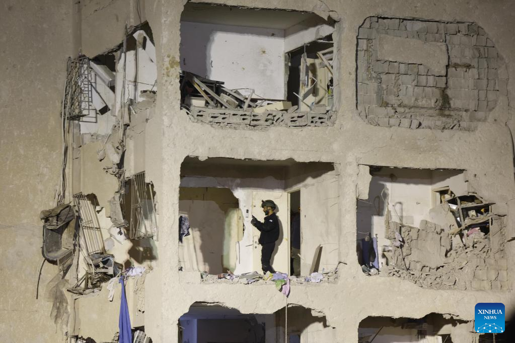 An emergency responder works at an impact site of an Iranian missile attack in Arad, southern Israel, March 22, 2026. Israel's national emergency service Magen David Adom (MDA) said in a statement that at least 64 people were injured on Saturday night in the southern Israeli city of Arad by a missile fired from Iran.