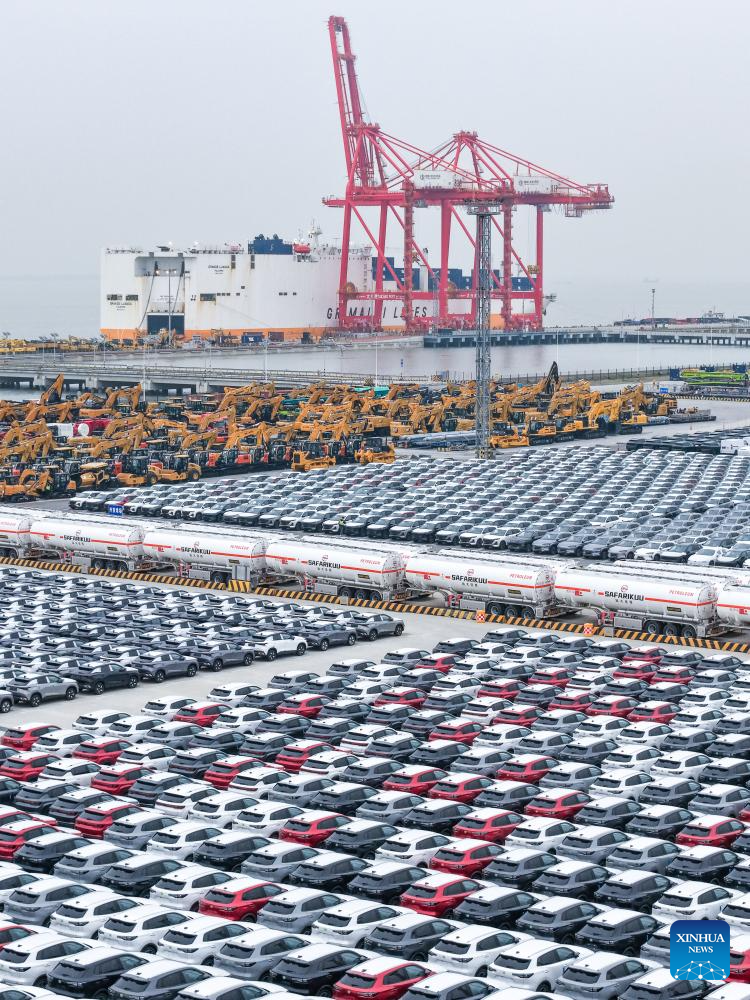 An aerial drone photo taken on March 20, 2026 shows vehicles for export at a yard of Taicang Port in east China's Jiangsu Province. In 2025, Taicang Port processed 8.736 million TEUs of container throughput and 299 million tonnes of cargo throughput. The number of international navigation vessels entering and exiting the port reached 7,957, reflecting a 6% year-on-year increase. (Xinhua/Li Bo)