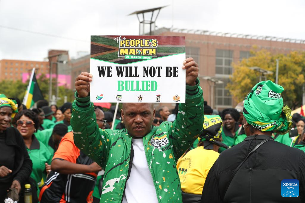 A man holding a placard attends a march marking Human Rights Day at Mary Fitzgerald Square in Johannesburg, South Africa, March 21, 2026. (Xinhua/Chen Wei)