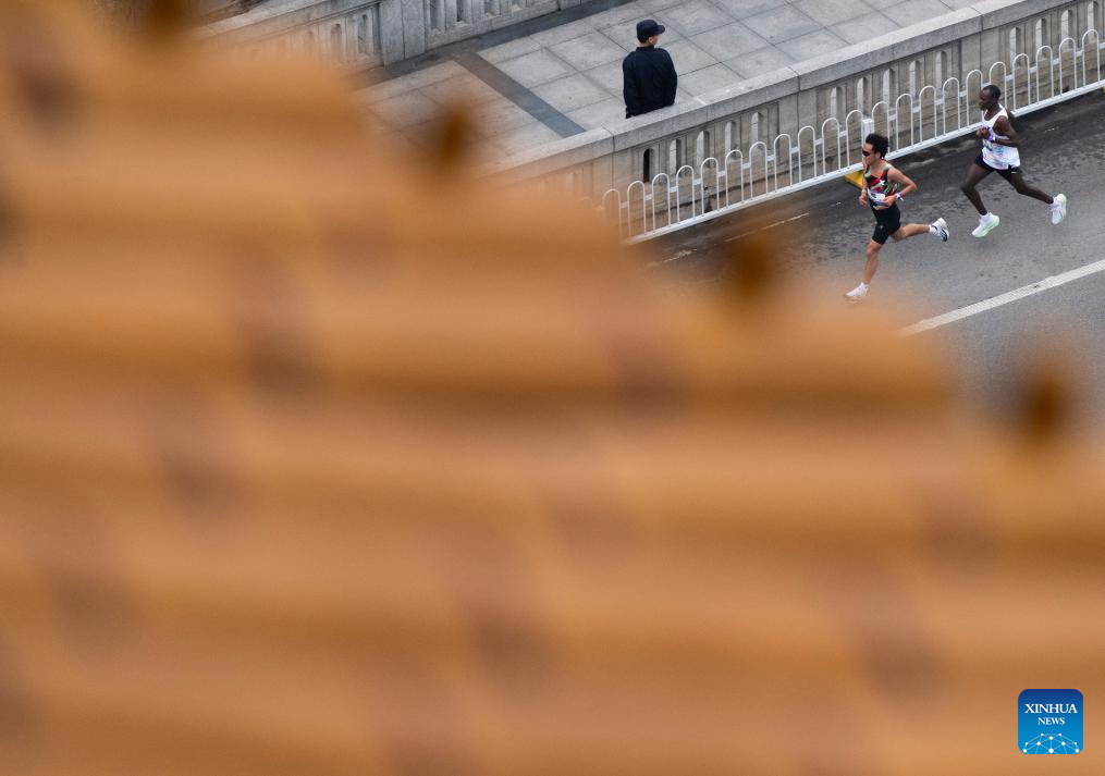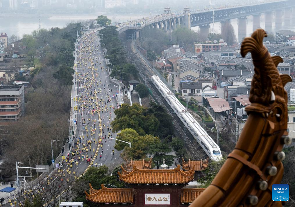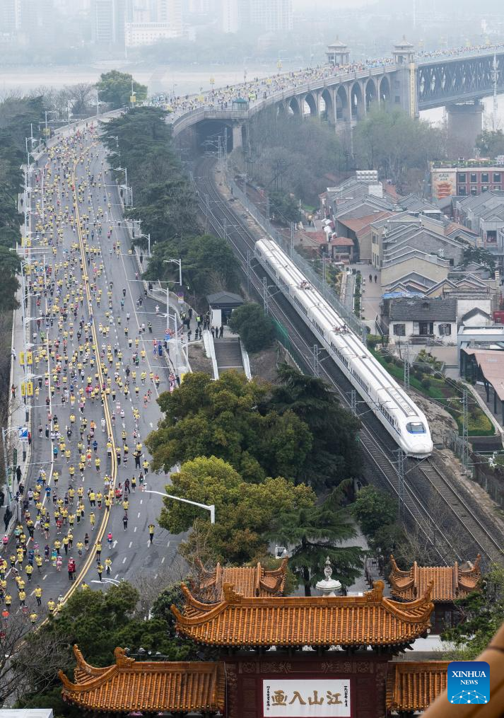 Participants run past the landmark Huanghelou, or the Yellow Crane Tower, during the Bank of China Wuhan Marathon 2026 in Wuhan, central China's Hubei province, March 22, 2026. (Xinhua/Wu Zhizun)