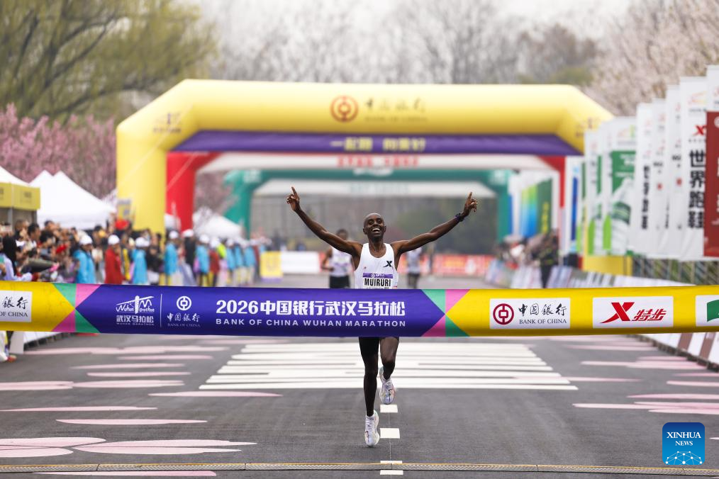 John Mburu Muiruri of Kenya crosses the finishing line during the Bank of China Wuhan Marathon 2026 in Wuhan, central China's Hubei province, March 22, 2026. (Xinhua/Xiao Yijiu)