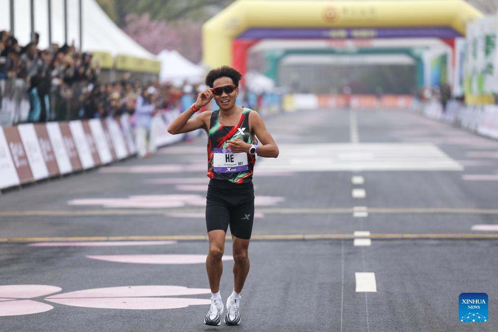 He Jie of China reacts after crossing the finishing line during the Bank of China Wuhan Marathon 2026 in Wuhan, central China's Hubei province, March 22, 2026. (Xinhua/Xiao Yijiu)