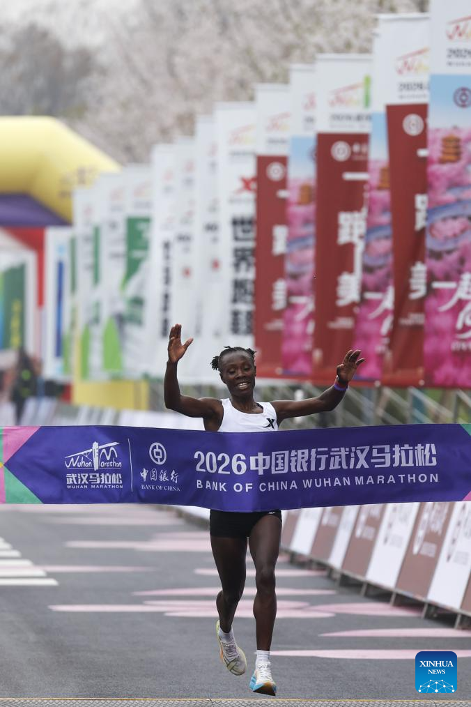 Veronicah Njeri Maina of Kenya crosses the finishing line during the Bank of China Wuhan Marathon 2026 in Wuhan, central China's Hubei province, March 22, 2026. (Xinhua/Xiao Yijiu)
