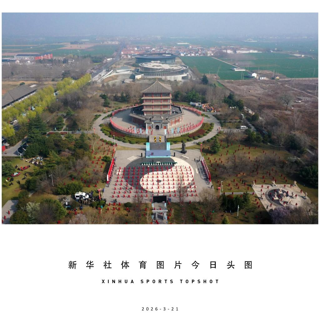 An aerial drone photo taken on March 21, 2026 shows Taijiquan practitioners performing in Wenxian County, Jiaozuo City, central China's Henan Province. A celebration of the first International Taijiquan Day was held here on Saturday. (Xinhua/Hao Yuan)