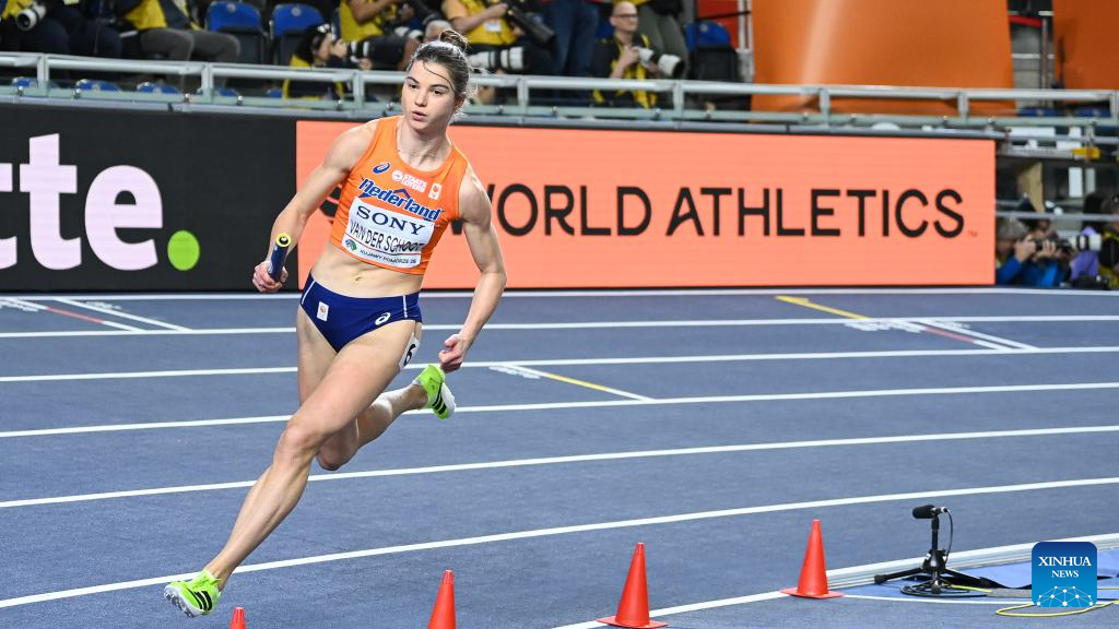 Myrte Van Der Schoot of the Netherlands competes during the mixed 4x400m relay final at the 2026 World Athletics Indoor Championships in Torun, Poland, March 21, 2026. (Xinhua/Zhang Haofu)