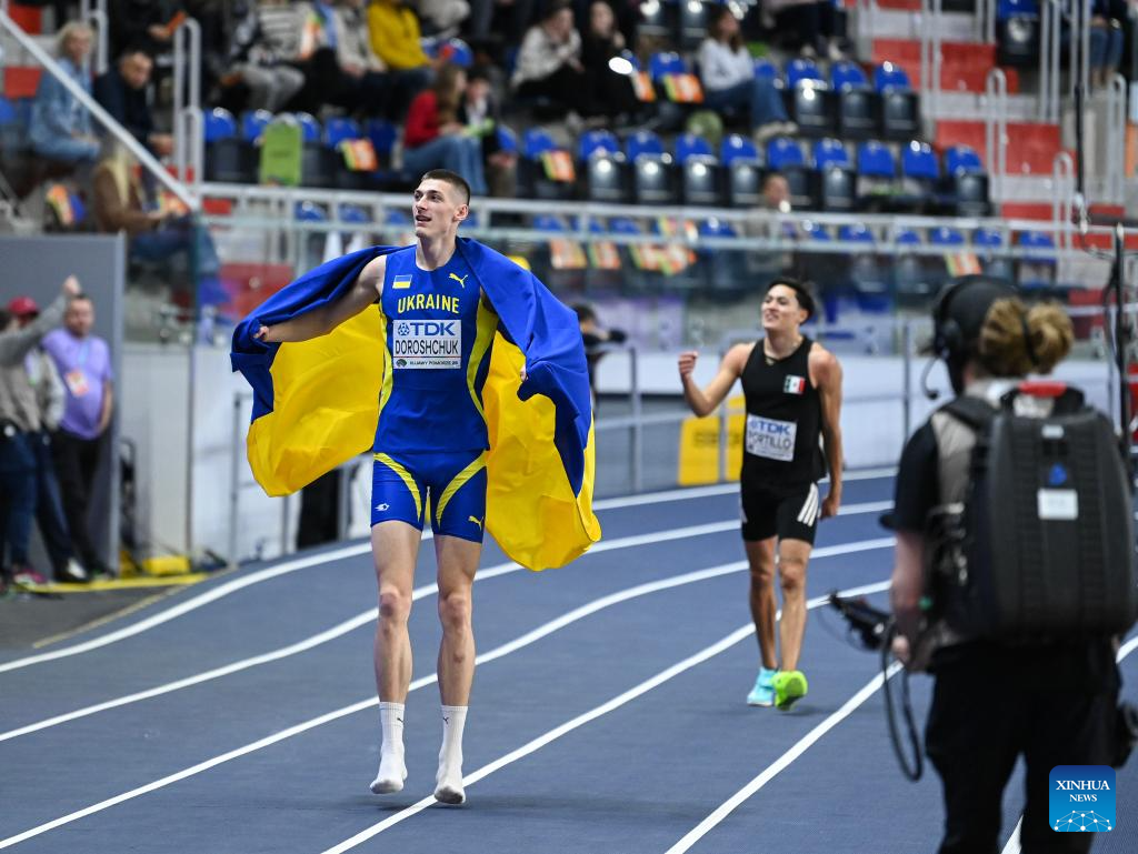 Oleh Doroschchuk of Ukraine celebrates after the men's high jump final at the 2026 World Athletics Indoor Championships in Torun, Poland, March 21, 2026. (Xinhua/Zhang Haofu)