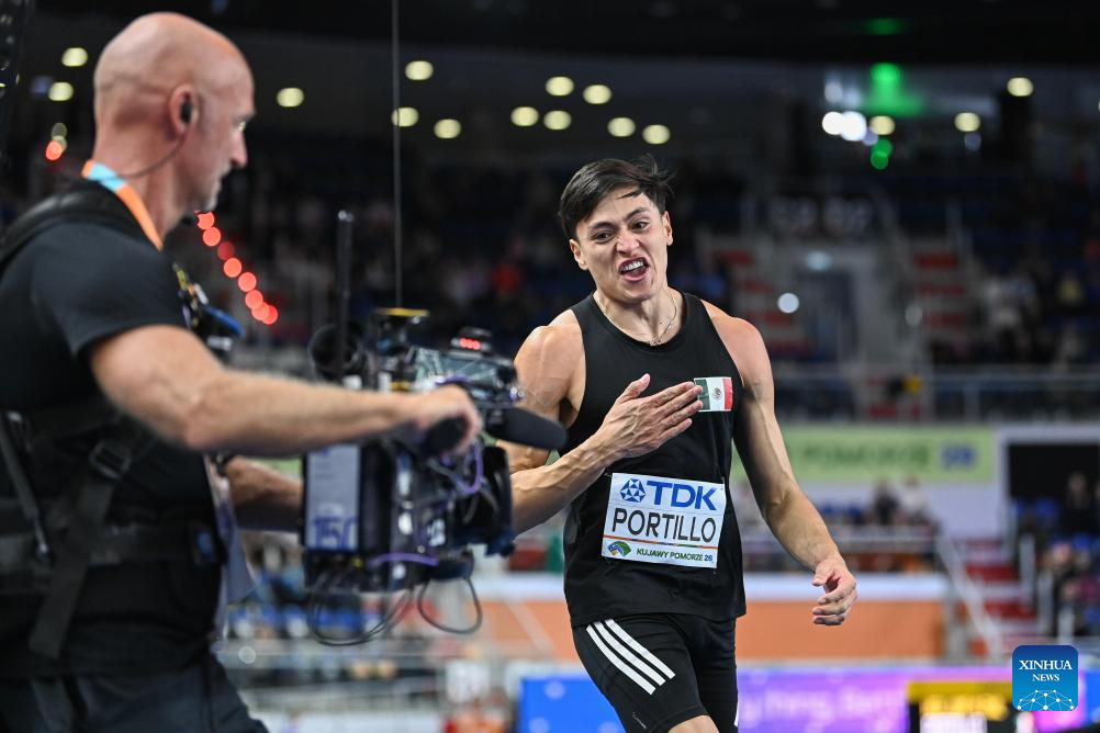 Erick Portillo of Mexico reacts during the men's high jump final at the 2026 World Athletics Indoor Championships in Torun, Poland, March 21, 2026. (Xinhua/Zhang Haofu)