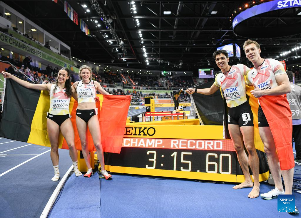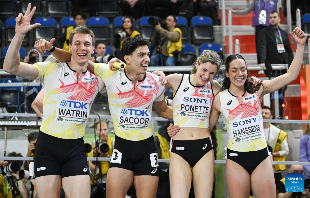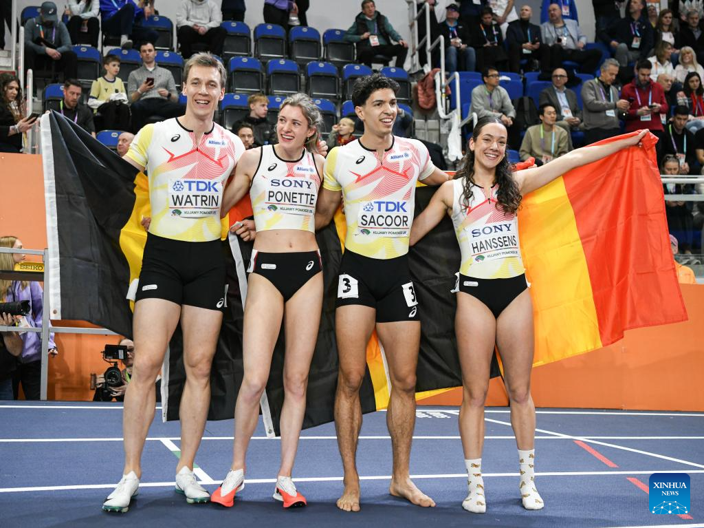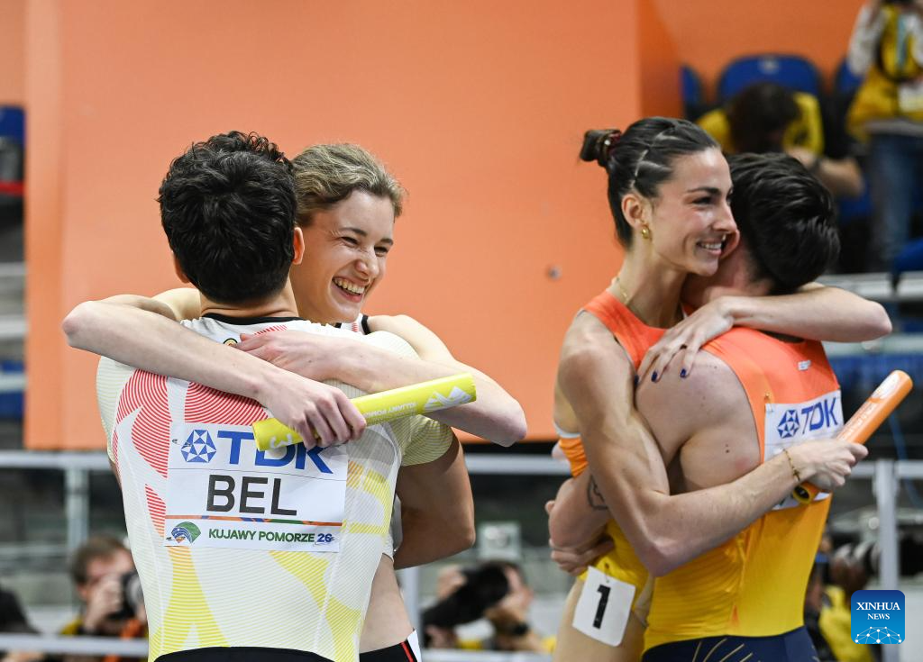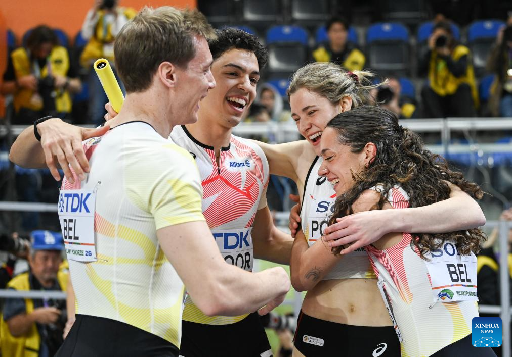 Helena Ponette (2nd L) of Belgium celebrates with her teammate Jonathan Sacoor (1st L) after the mixed 4x400m relay final at the 2026 World Athletics Indoor Championships in Torun, Poland, March 21, 2026. (Xinhua/Zhang Haofu)