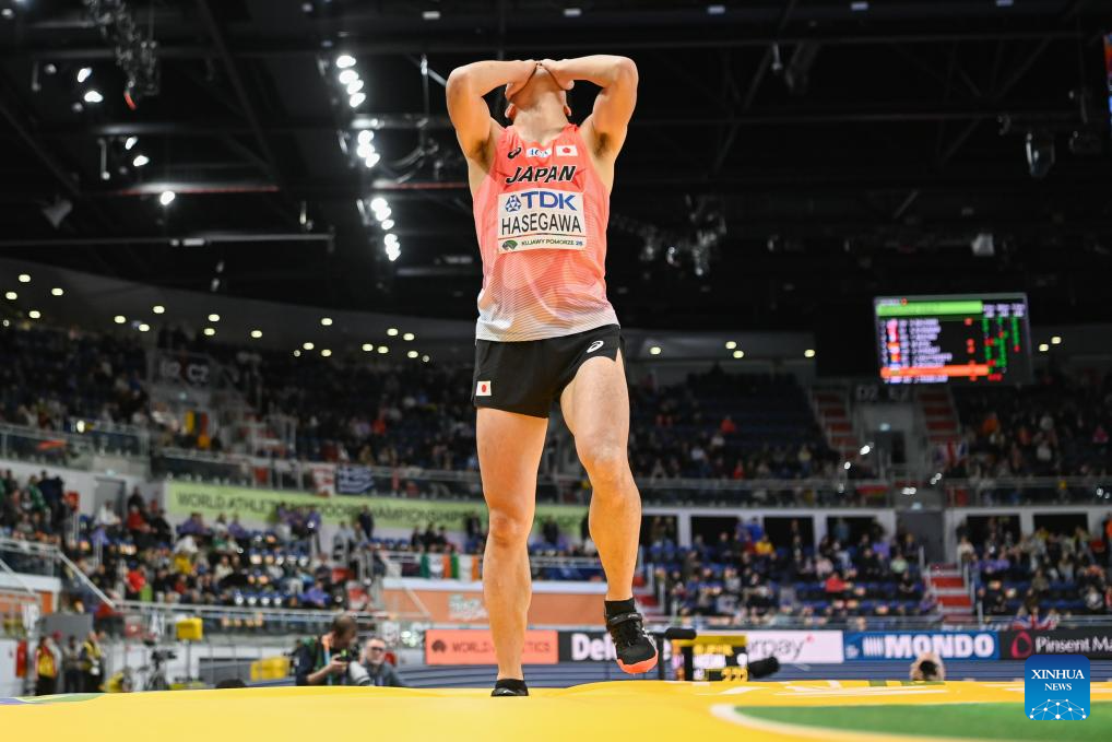 Hasegawa Naoto of Japan reacts during the men's high jump final at the 2026 World Athletics Indoor Championships in Torun, Poland, March 21, 2026. (Xinhua/Zhang Haofu)