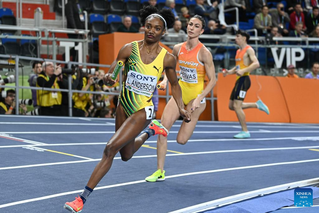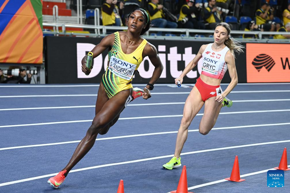 Shana Kaye Anderson (L) of Jamaica and Anna Gryc of Poland compete during the mixed 4x400m relay final at the 2026 World Athletics Indoor Championships in Torun, Poland, March 21, 2026. (Xinhua/Zhang Haofu)