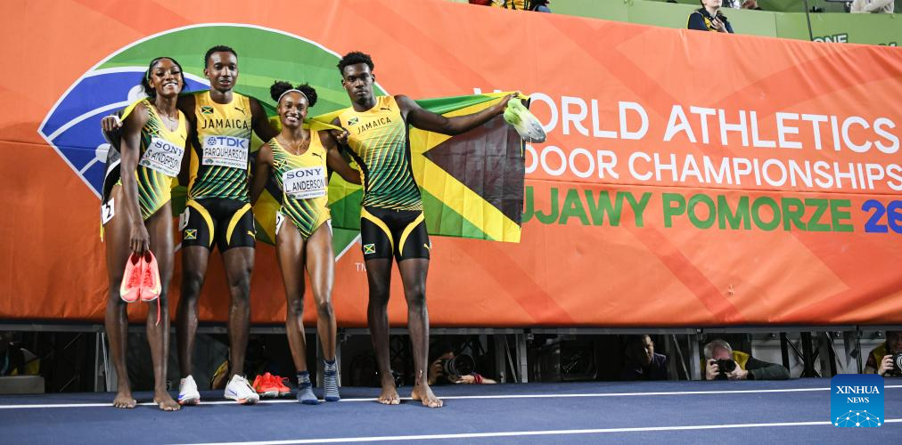 Shana Kaye Anderson, Kimar Farquharson, Leah Anderson and Delano Kennedy (L-R) of Jamaica pose after the mixed 4x400m relay final at the 2026 World Athletics Indoor Championships in Torun, Poland, March 21, 2026. Team Jamaica was later disqualified. (Xinhua/Zhang Haofu)