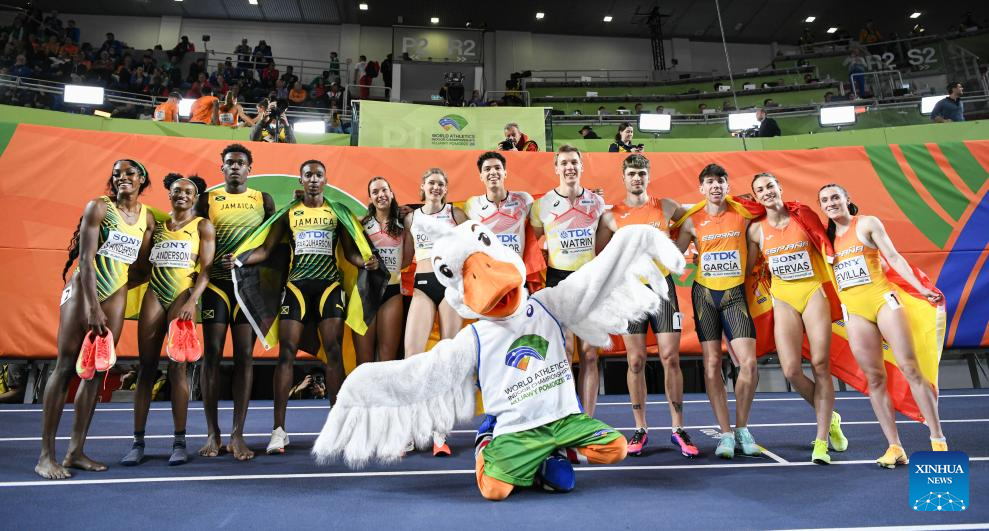 Gold medalists team Belgium (C), silver medalists team Spain (R) and team Jamaica pose after the mixed 4x400m relay final at the 2026 World Athletics Indoor Championships in Torun, Poland, March 21, 2026. Team Jamaica was later disqualified. (Xinhua/Zhang Haofu)