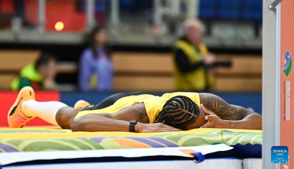 Romaine Beckford of Jamaica reacts during the men's high jump final at the 2026 World Athletics Indoor Championships in Torun, Poland, March 21, 2026. (Xinhua/Zhang Haofu)