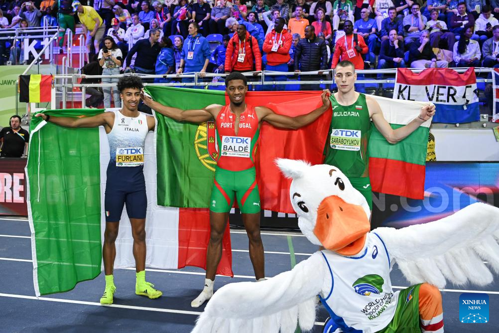 Gold medalist Gerson Balde (C) of Portugal, silver medalist Mattia Furlani (L) of Italy and Bronze medalist Bozhidar Saraboyukov of Bulgaria pose after the men's long jump final at the 2026 World Athletics Indoor Championships in Torun, Poland, March 22, 2026. (Xinhua/Zhang Haofu)