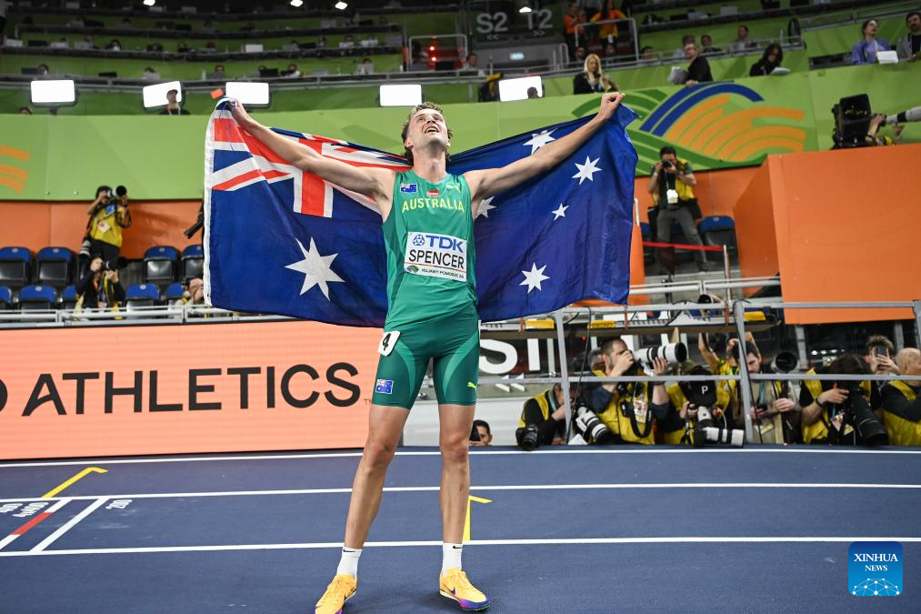 Adam Spencer of Australia celebrates after the men's 1500m final at the 2026 World Athletics Indoor Championships in Torun, Poland, on March 22, 2026. (Xinhua/Zhang Haofu)