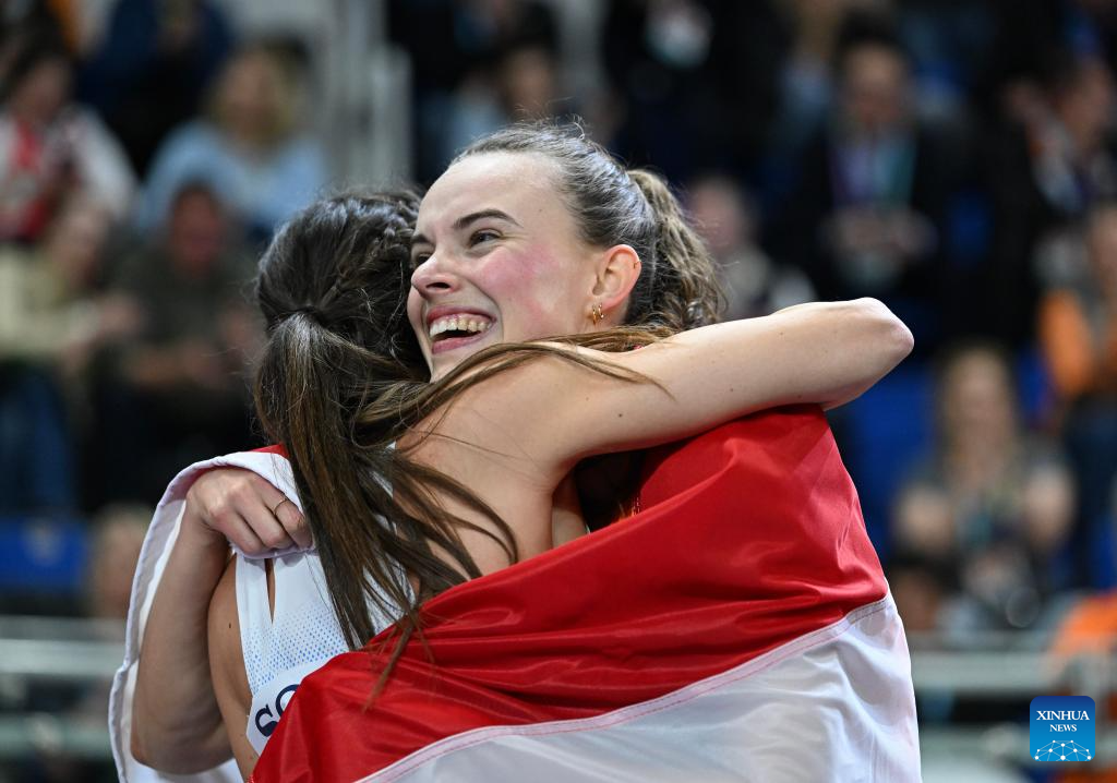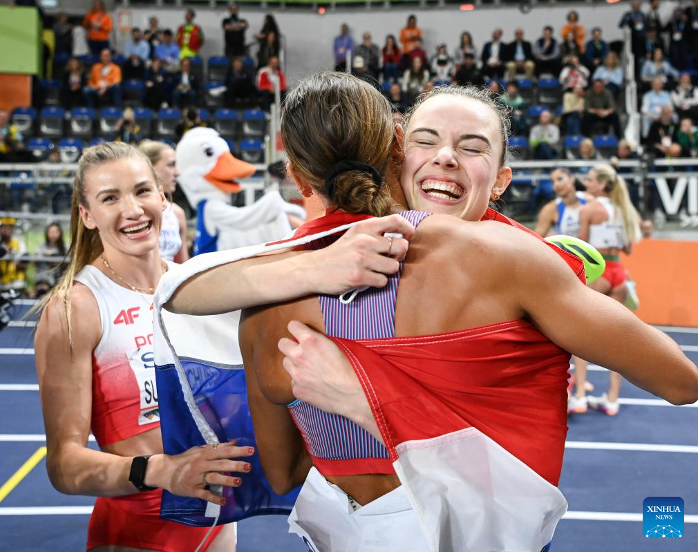Gold medalist Sofie Dokter (R) of the Netherlands celebrates after 800 metres of pentathlon at the 2026 World Athletics Indoor Championships in Torun, Poland, March 22, 2026. (Xinhua/Zhang Haofu)
