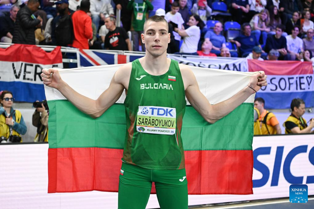 Bronze medalist Bozhidar Saraboyukov of Bulgaria poses after the men's long jump final at the 2026 World Athletics Indoor Championships in Torun, Poland, March 22, 2026. (Xinhua/Zhang Haofu)