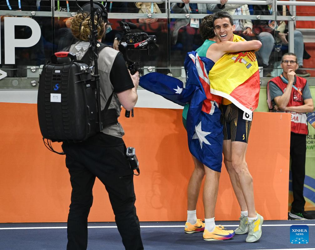 Mariano Garcia (R) of Spain celebrates with Adam Spencer of Australia after the men's 1500m final at the 2026 World Athletics Indoor Championships in Torun, Poland, on March 22, 2026. (Xinhua/Zhang Haofu)