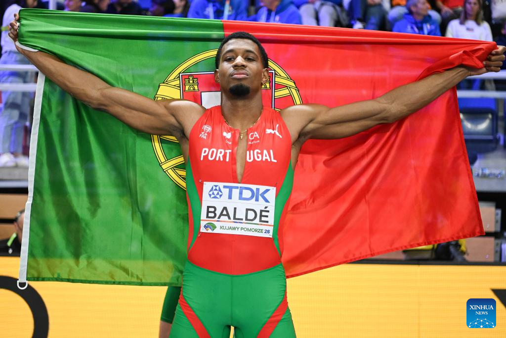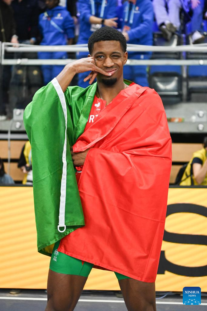 Gerson Balde of Portugal poses after winning the men's long jump final at the 2026 World Athletics Indoor Championships in Torun, Poland, March 22, 2026. (Xinhua/Zhang Haofu)