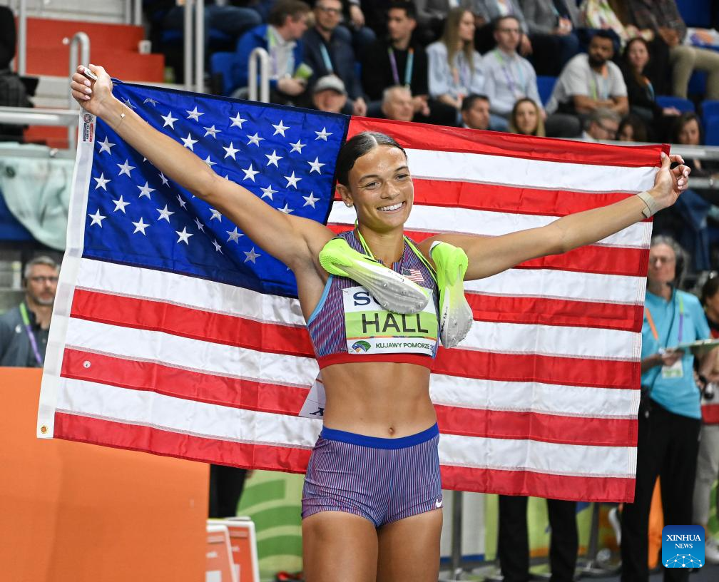 Silver medalist Anna Hall of the United States celebrates after 800 metres of pentathlon at the 2026 World Athletics Indoor Championships in Torun, Poland, March 22, 2026. (Xinhua/Zhang Haofu)