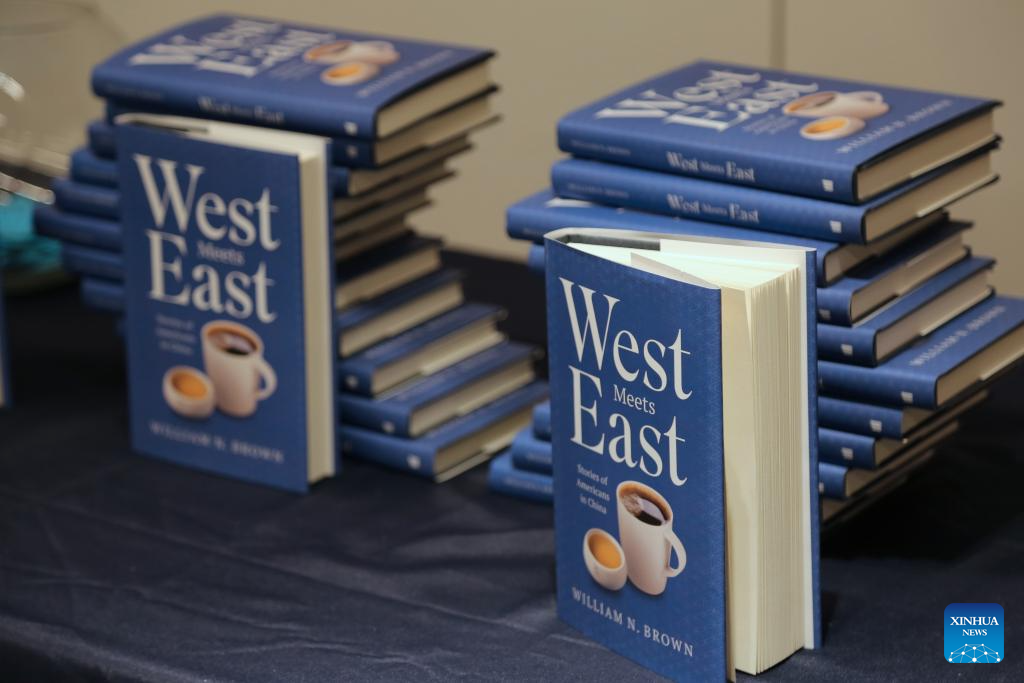 Copies of William Brown's book "West Meets East: Stories of Americans in China" are on display at a book launch event in New York, the United States, on March 21, 2026. William Brown, a professor at the School of Management at Xiamen University, launched his book "West Meets East: Stories of Americans in China" in New York on Saturday. (Xinhua/Liu Yanan)