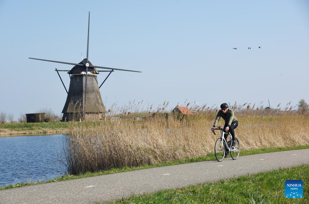 A cyclist rides past a windmill in Kinderdijk, the Netherlands, March 22, 2026.