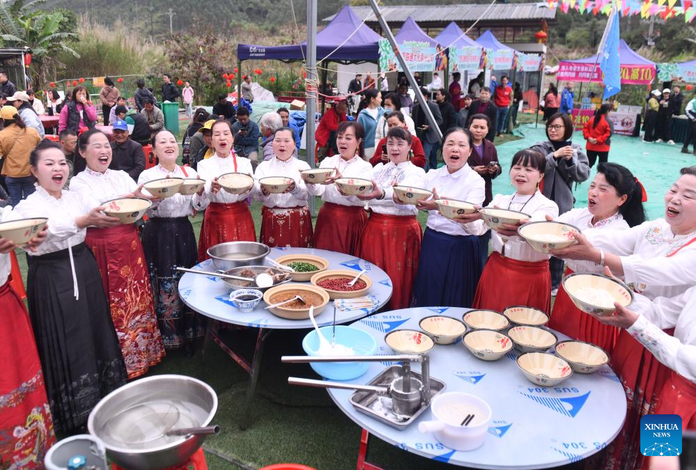 Staff members make Shengzha rice noodles for locals and tourists during an intangible cultural heritage craftsmanship competition in Dahua Yao Autonomous County, Hechi City, south China's Guangxi Zhuang Autonomous Region, March 21, 2026.