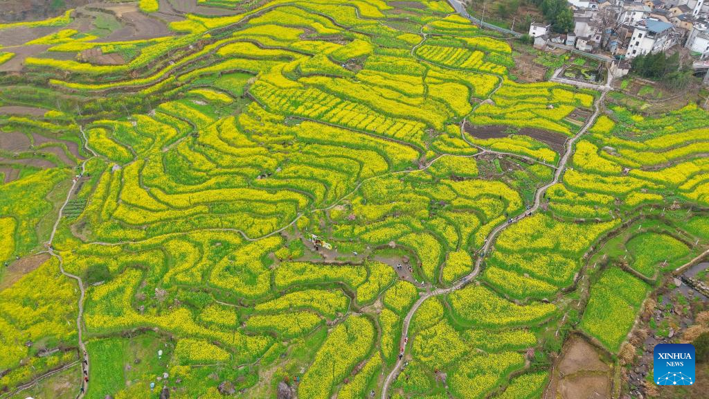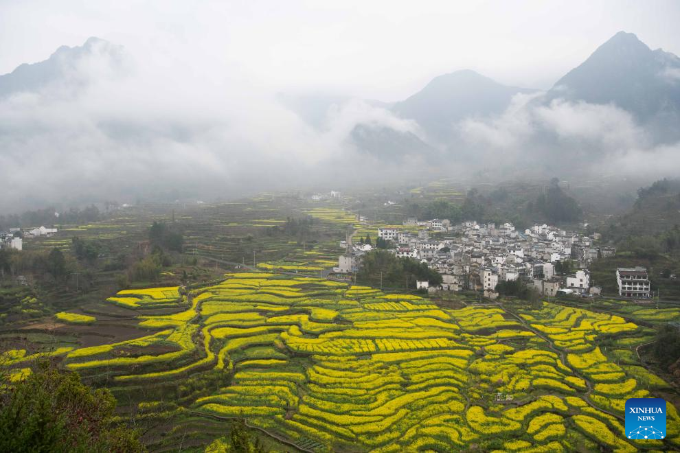 This photo taken on March 23, 2026 shows the scenery of rapeseed flower fields in Xingfu Village, Jixi County, Xuancheng City, east China's Anhui Province. (Xinhua/Zhang Duan)