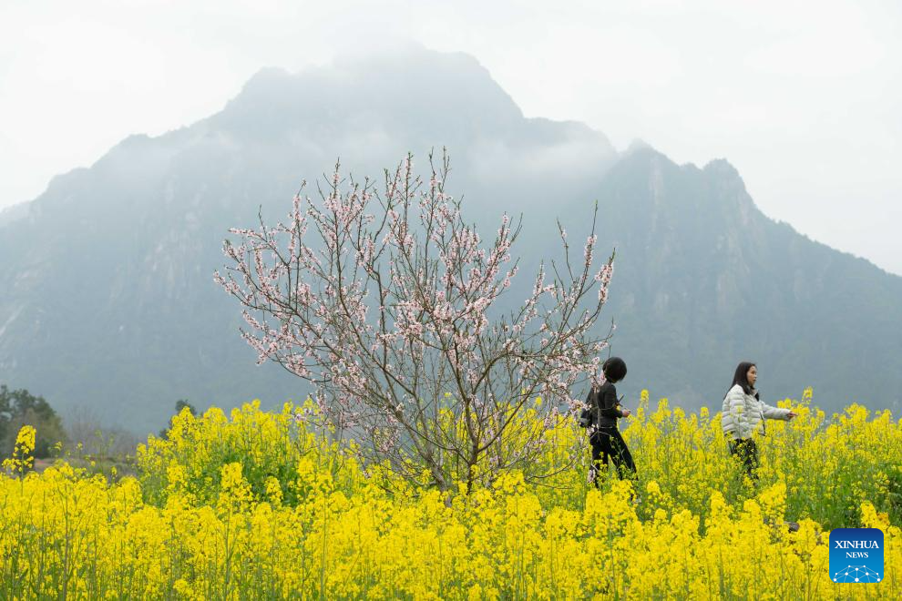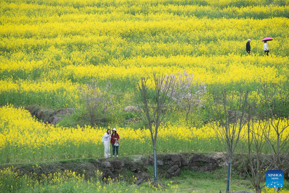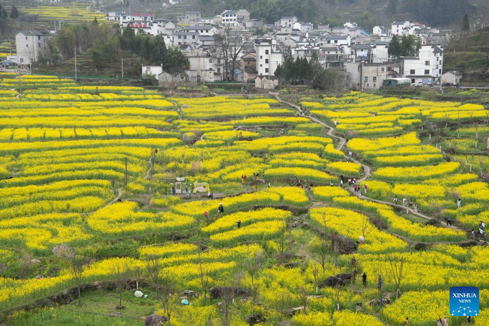 Tourists enjoy rapeseed flowers in Xingfu Village, Jixi County, Xuancheng City, east China's Anhui Province, March 22, 2026. (Xinhua/Zhang Duan)