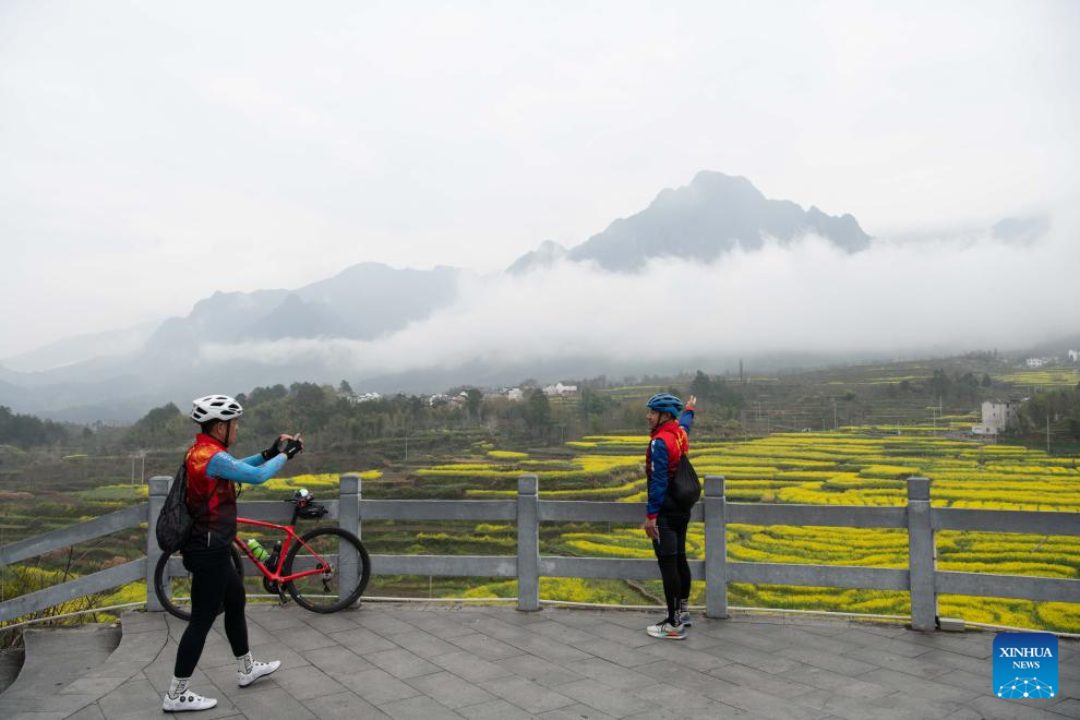 Cyclists take photos with rapeseed flower fields in the background in Xingfu Village, Jixi County, Xuancheng City, east China's Anhui Province, March 23, 2026. (Xinhua/Zhang Duan)