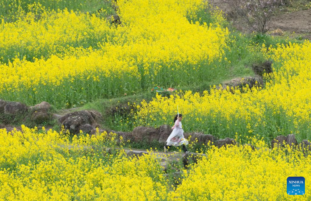 This photo taken on March 22, 2026 shows rapeseed flowers in Xingfu Village, Jixi County, Xuancheng City, east China's Anhui Province. (Xinhua/Zhang Duan)