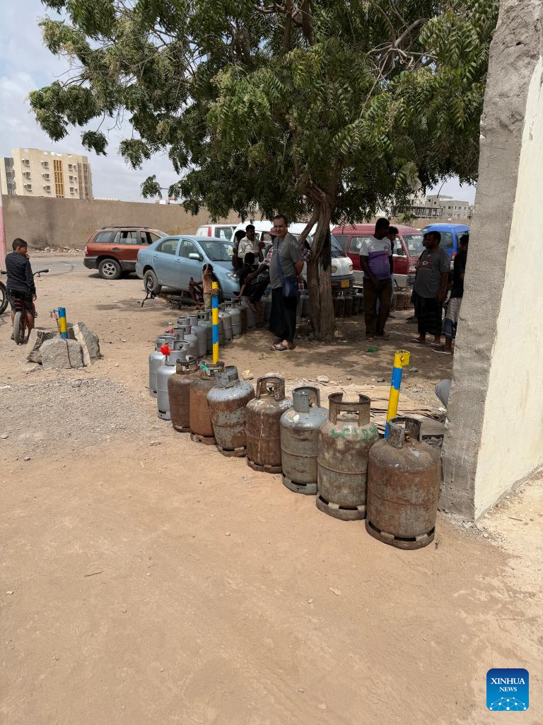 Photo taken by cellphone shows people gathering beside rows of empty gas cylinders while waiting to refill them in the southern port city of Aden, Yemen, March 24, 2026. A fresh rise in prices of essential goods and services is deepening economic hardship in war-ravaged Yemen, as households face mounting costs stemming from supply disruptions, higher import expenses and recent policy adjustments affecting key commodities. (Photo by Murad/Xinhua)