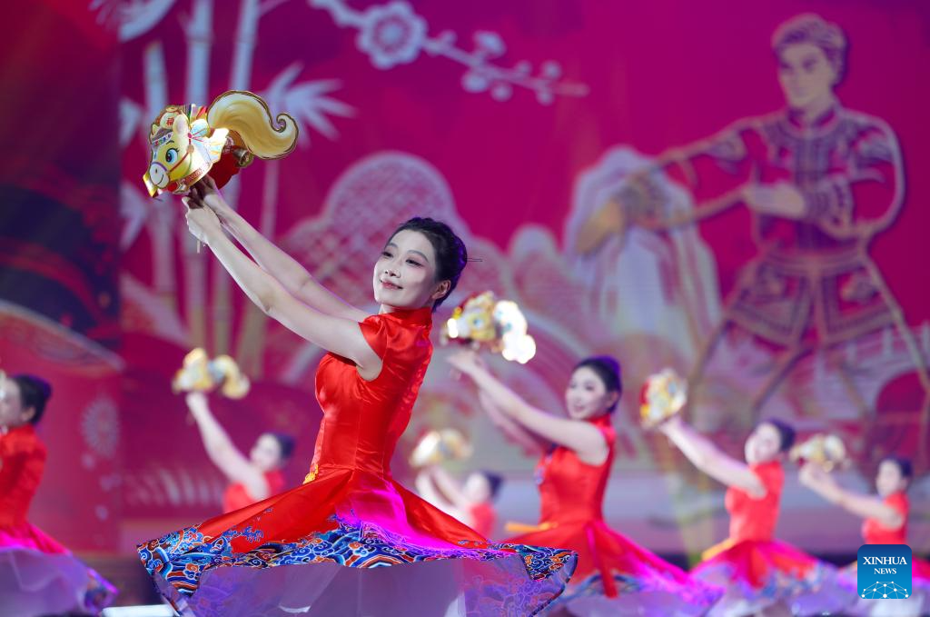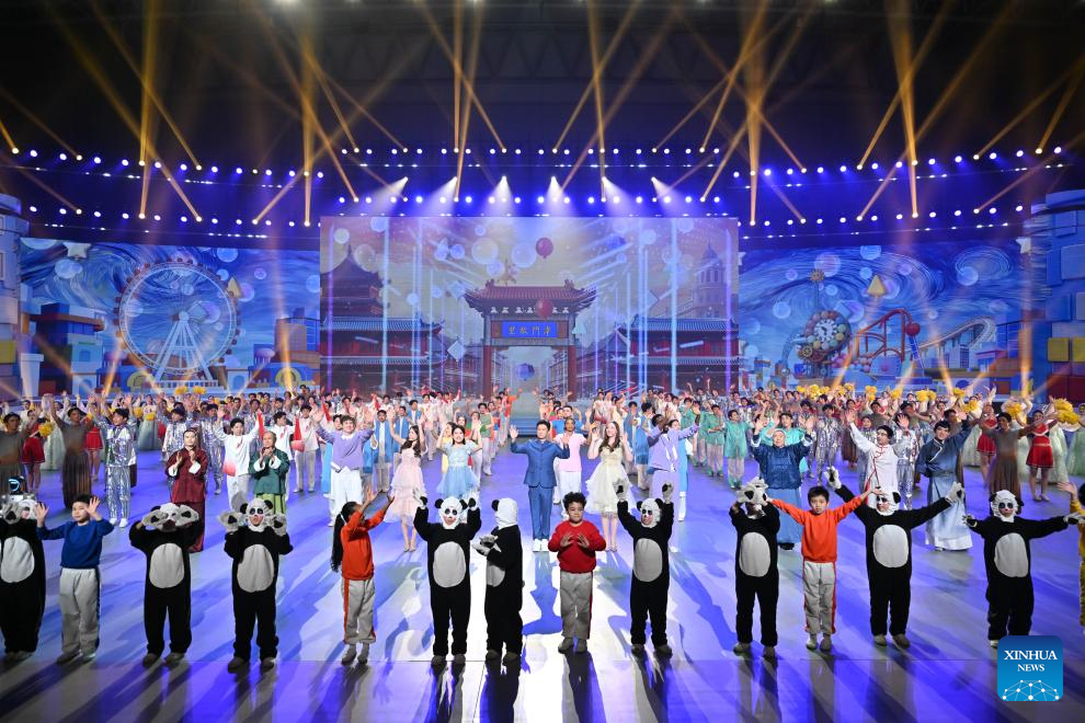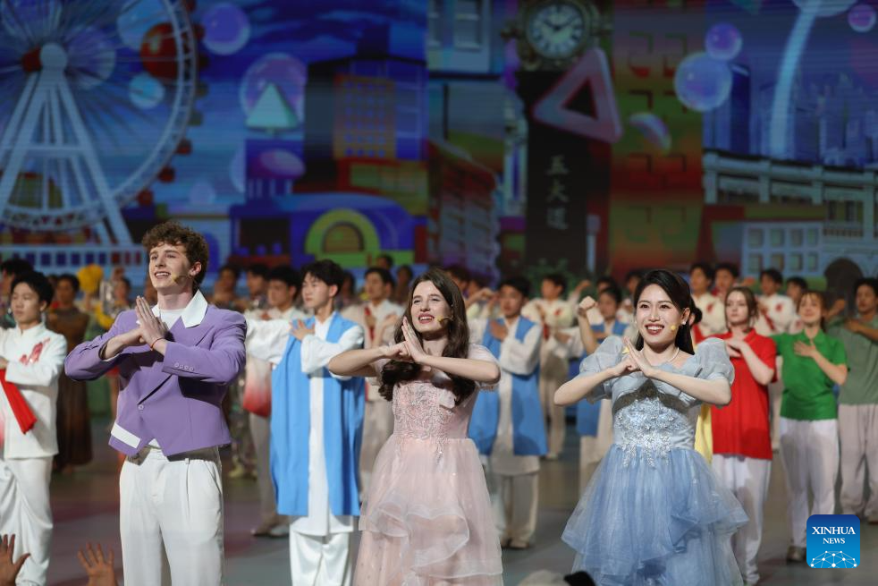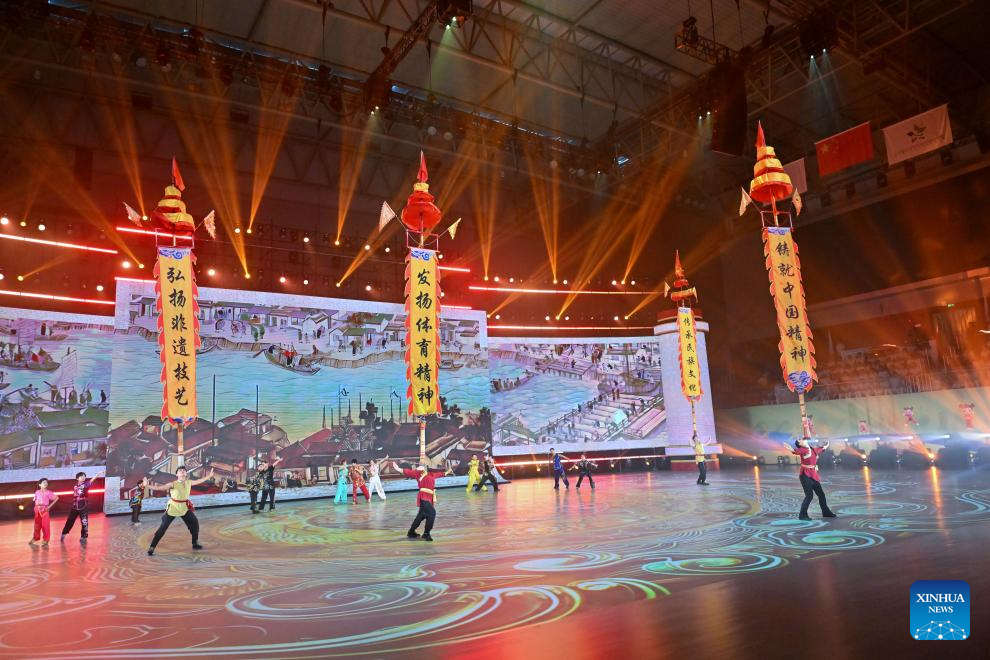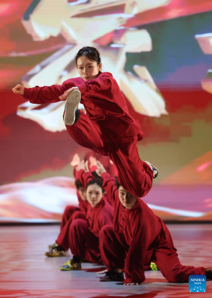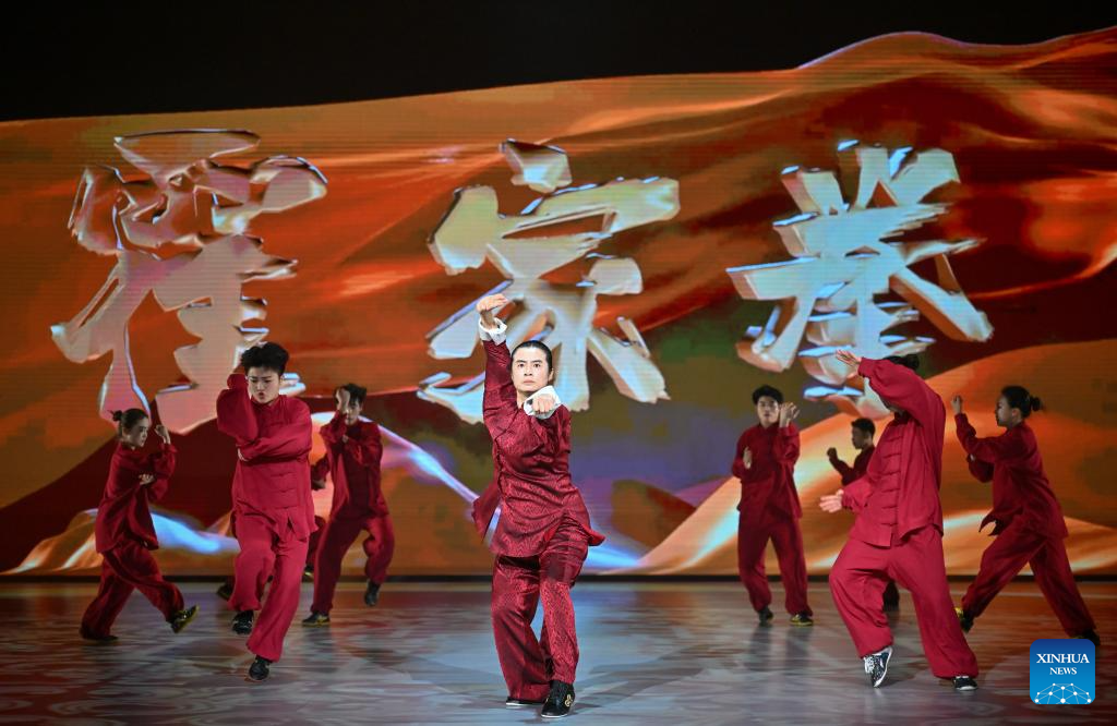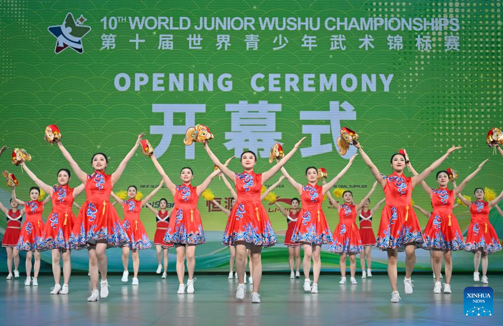 Artists perform during the opening ceremony of the 10th World Junior Wushu Championships in Tianjin, north China, March 25, 2026. (Xinhua/Sun Fanyue)