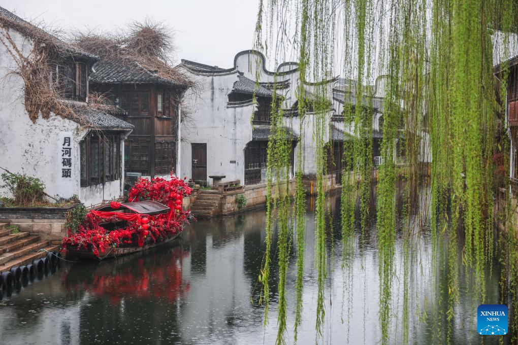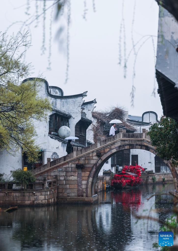 This photo taken on March 24, 2026 shows the spring scenery of the Yuehe historical and cultural block in Nanhu District of Jiaxing City, east China's Zhejiang Province. Recently, the Yuehe historical and cultural block in Nanhu District of Jiaxing City has witnessed a flower consumption boom. In the flower market here, seasonal flowers such as tulips and violets are in full bloom, drawing locals and tourists to purchase. Meanwhile, the flower consumption has also boosted the surrounding catering and cultural and creative industries, bringing vitality to the "spring economy." (Xinhua/Xu Yu)