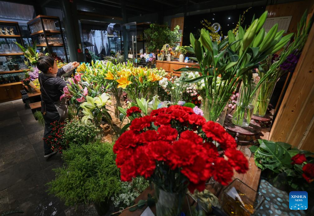 A florist arranges bouquets at the Yuehe historical and cultural block in Nanhu District, Jiaxing City, east China's Zhejiang Province, March 24, 2026. Recently, the Yuehe historical and cultural block in Nanhu District of Jiaxing City has witnessed a flower consumption boom. In the flower market here, seasonal flowers such as tulips and violets are in full bloom, drawing locals and tourists to purchase. Meanwhile, the flower consumption has also boosted the surrounding catering and cultural and creative industries, bringing vitality to the "spring economy." (Xinhua/Xu Yu)