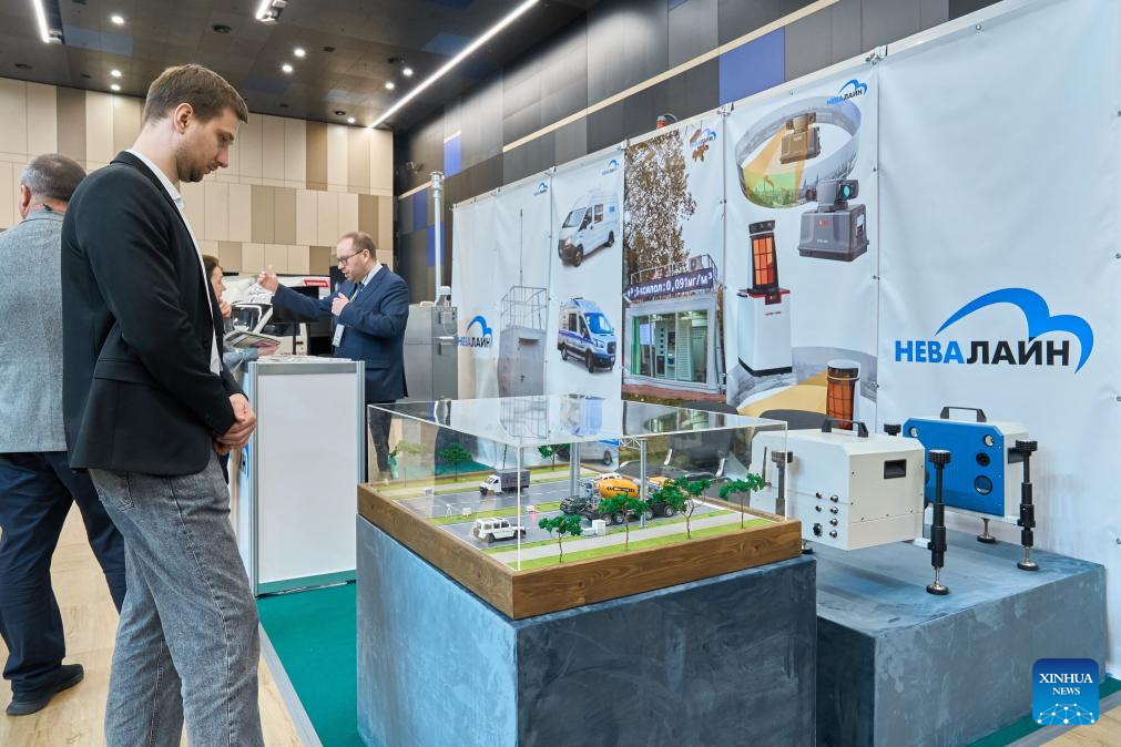 An automated vehicle emissions testing device is exhibited at the "Ecology of a Big City" international environmental forum in St. Petersburg, Russia, March 24, 2026. The forum kicked off here on Tuesday, attracting more than 6,000 participants. (Photo by Guo Feizhou/Xinhua)