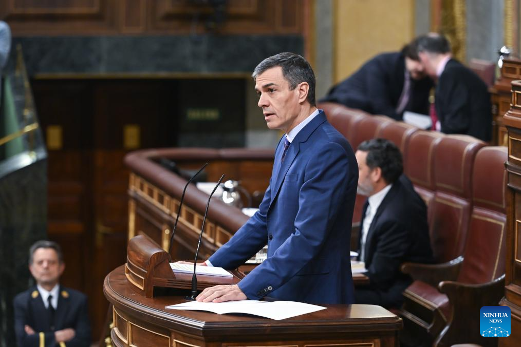 Spanish Prime Minister Pedro Sanchez speaks at the Congress of Deputies in Madrid, Spain, March 25, 2026. Sanchez on Wednesday reiterated his opposition to the war in Iran, which has spread across the Middle East, criticizing the military actions of the United States and Israel. (Photo by Gustavo Valiente/Xinhua)