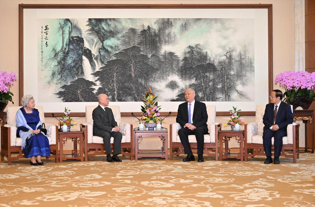 Cai Qi, a member of the Standing Committee of the Political Bureau of the Communist Party of China (CPC) Central Committee and a member of the Secretariat of the CPC Central Committee, meets with Cambodian King Norodom Sihamoni and Queen Mother Norodom Monineath Sihanouk in Beijing, capital of China, on March 25, 2026. (Xinhua/Yue Yuewei)