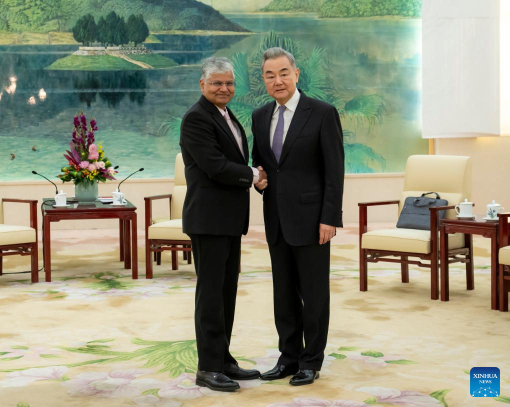 Chinese Foreign Minister Wang Yi, also a member of the Political Bureau of the Communist Party of China Central Committee, meets with Pradeep Kumar Rawat, the outgoing Indian ambassador to China, in Beijing, capital of China, March 26, 2026. (Xinhua/Zhai Jianlan)